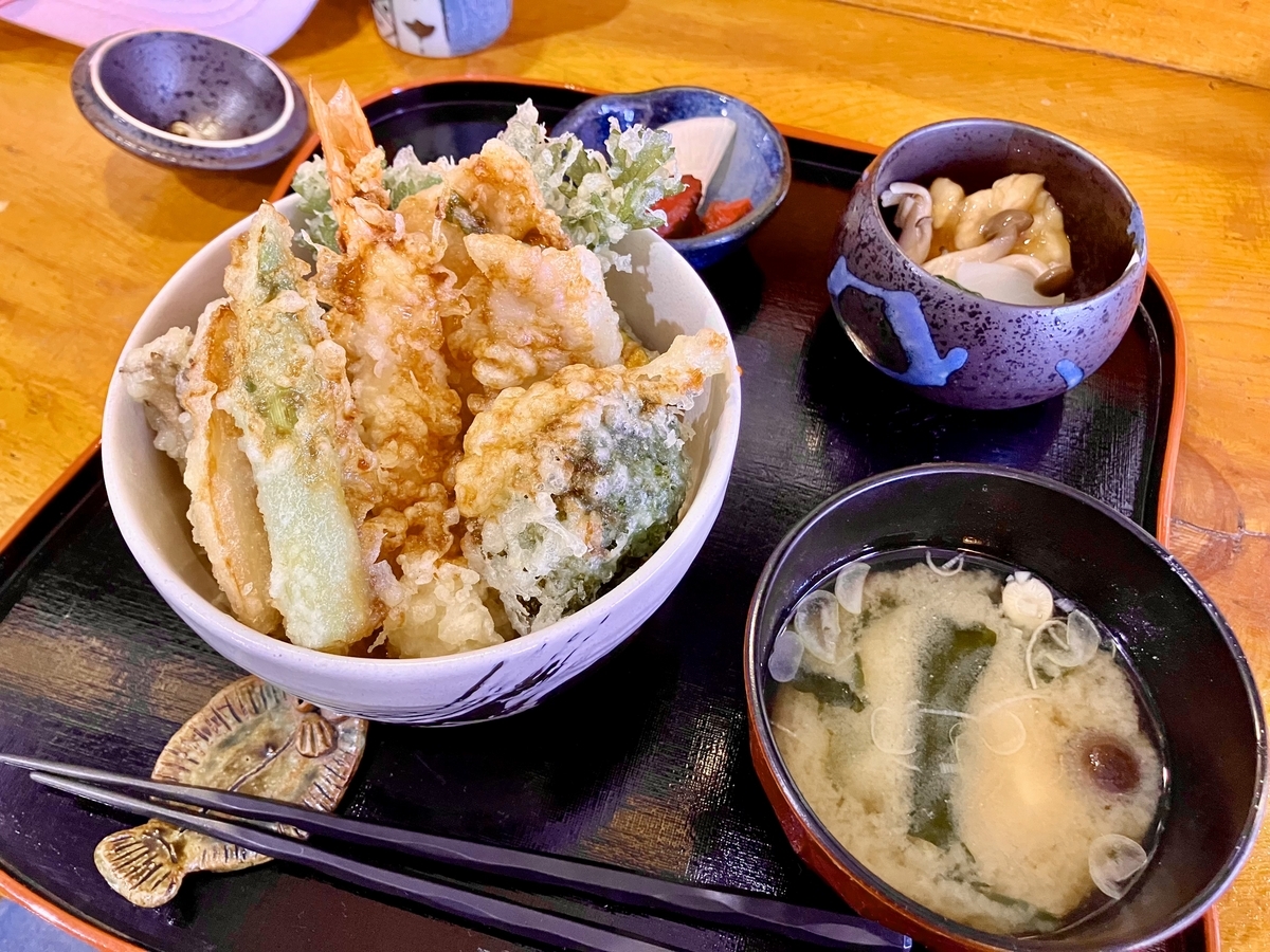 たくさんあるランチメニューの中から天丼を選択したが、8種類ほど乗せられた天ぷらはサクッと上がっていて、ひとつ前の蕎麦屋の天ぷらよりも美味かった。